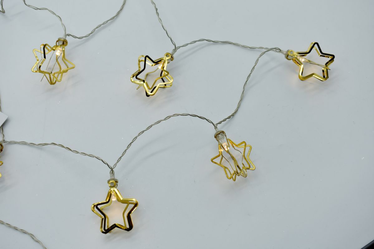 CATENA DI 10 STELLINE A PUNTA TONDA IN METALLO DORATO CON  LED A LUCE CALDA FISSA