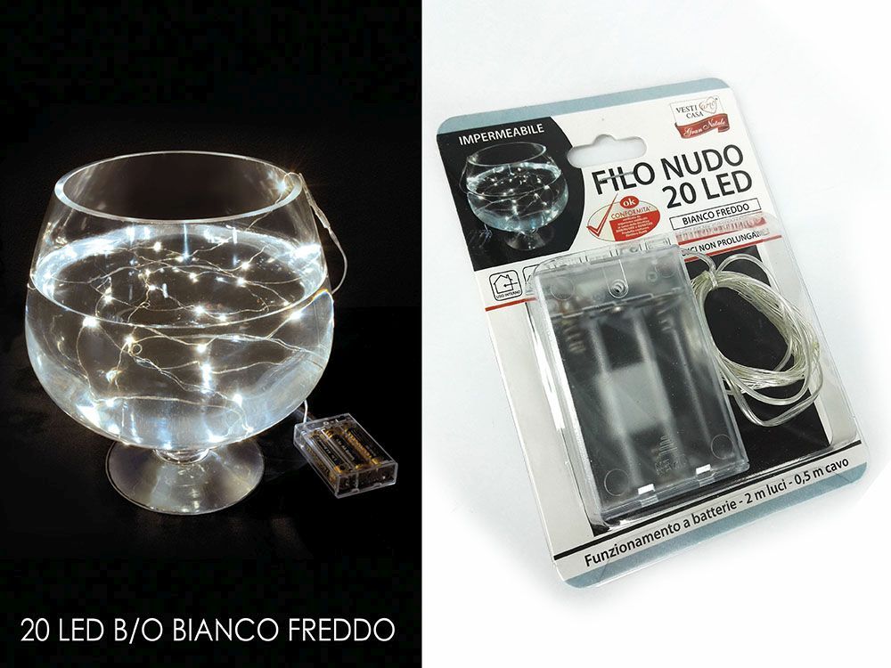 CATENA IMPERMEABILE DI FILO NUDO CON 20 MICROLED BIANCO FREDDO, ALIMENTATA DA 3 BATTERIE AA (NON INCLUSE)