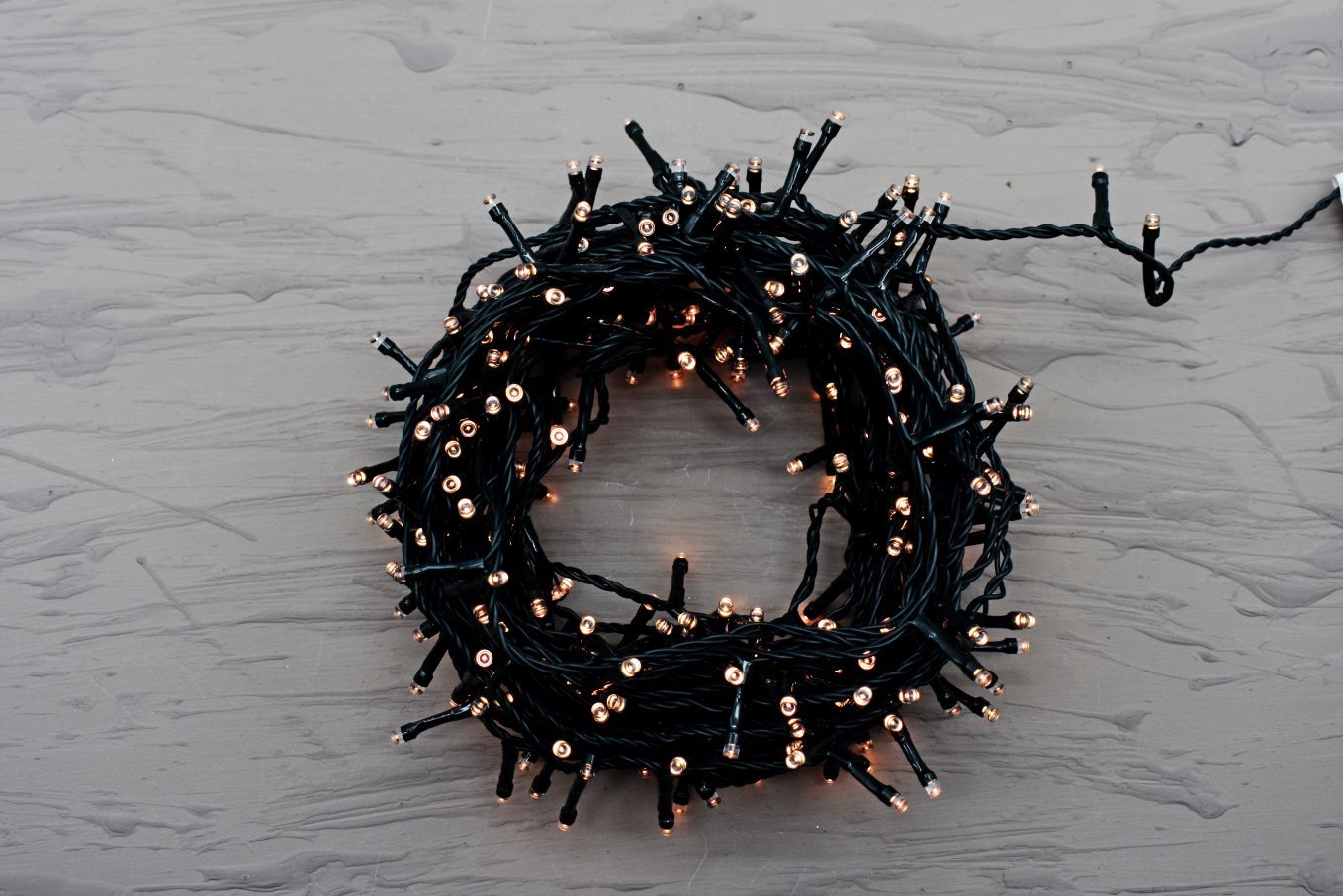 Catena luminosa 300 led luce calda a batteriacon giochi di luce e timer (6 ore ON - 18 ore OFF)per uso esterno e interno lunghezza cavo: 15,00 m + 20 cmdistanza fra led: 5 cmø led: 5mmcolore filo: verde