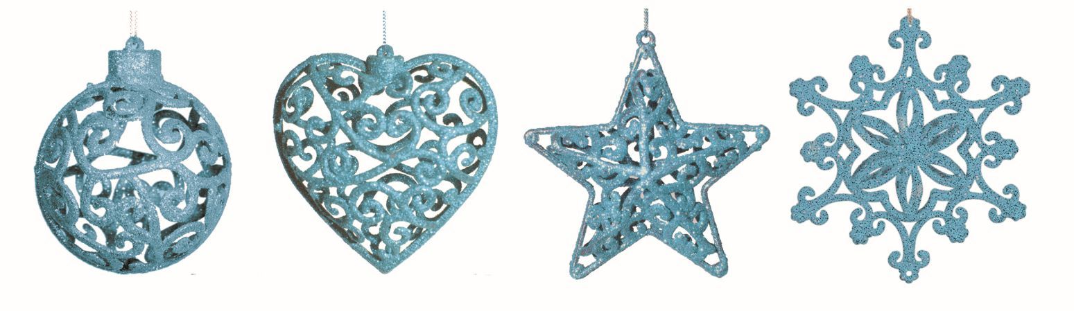 ADDOBBI PER ALBERO DI NATALE 3D, COLOR ICE BLUE, IN FORME ASSORTITE (SFERA, CUORE, STELLA, FIOCCO DI NEVE)
