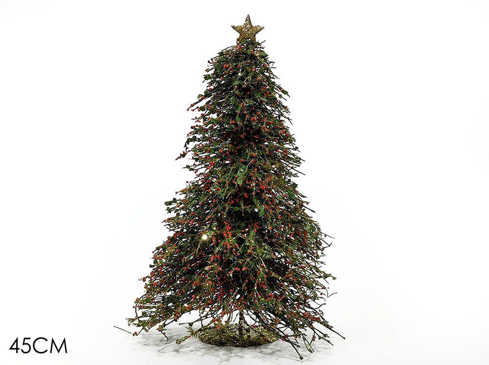 ALBERO DI NATALE VERDE CON RAMI SOTTILI GLITTER ORO E BACCHE ROSSE