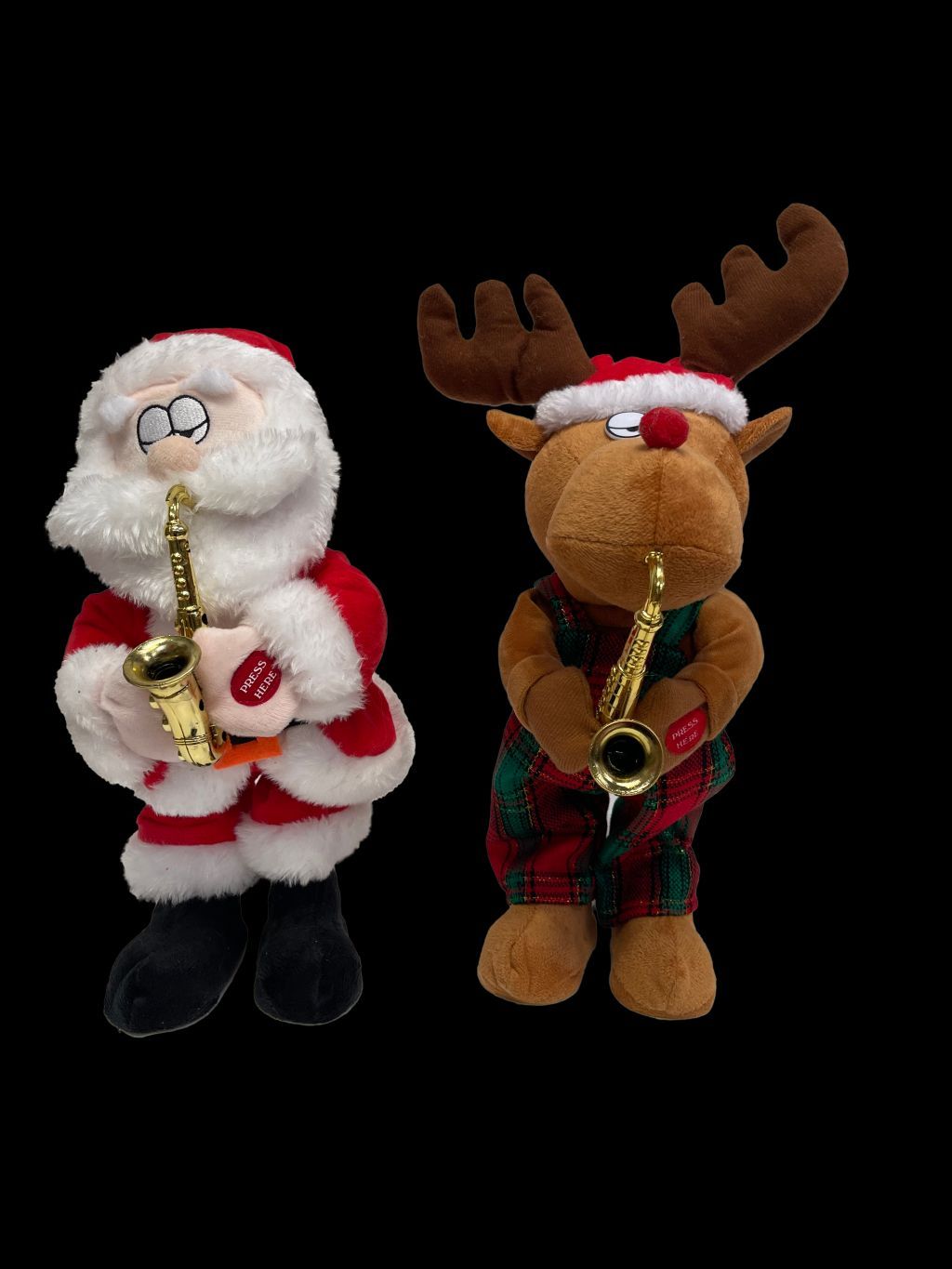 PELUCHES NATALIZI MUSICALI RAFFIGURANTI BABBO NATALE O UNA RENNA CON UN SAX,