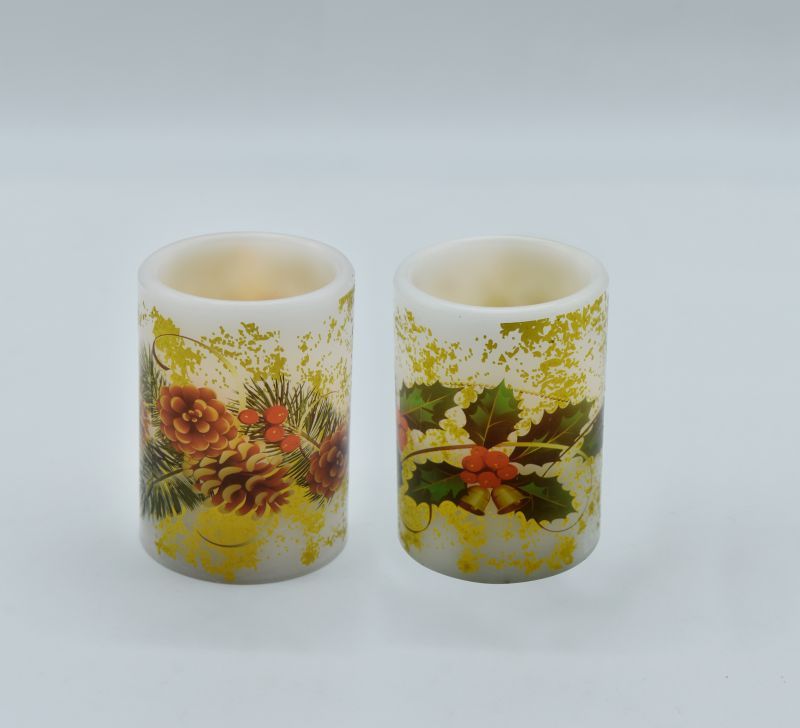 CANDELA COLOR AVORIO IN CERA CON DECORI NATALIZI, CON FIAMMA LED , A BATTERIA