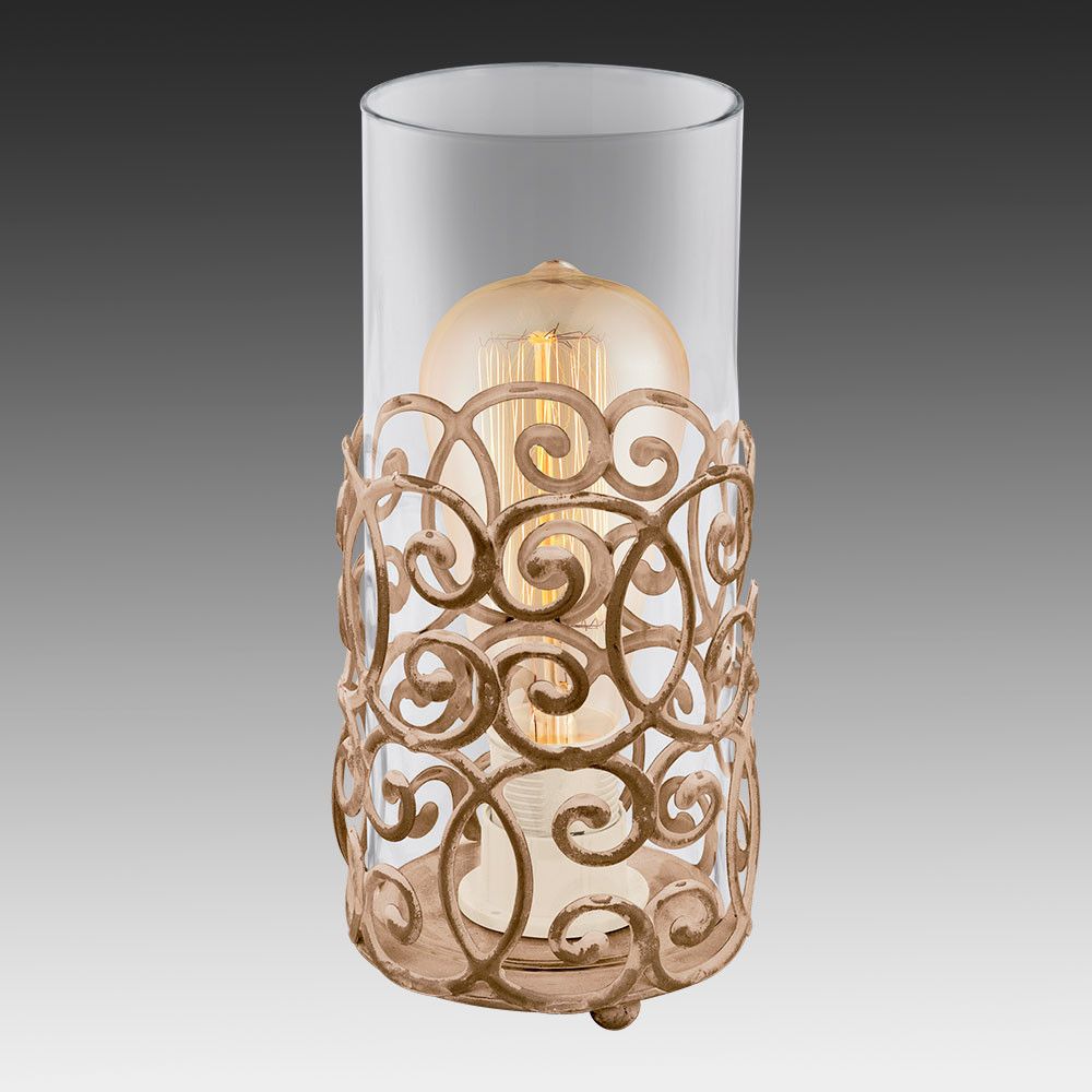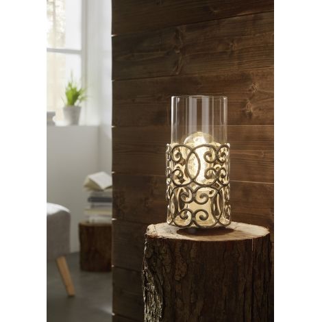 LAMPADA DA TAVOLO REALIZZATA IN ACCIAIO MARRONE PATINATO E VETRO TRASPARENTE. E' CORREDATO DA UN CAVO CON INTERRUTTORE DI ACCENSIONE