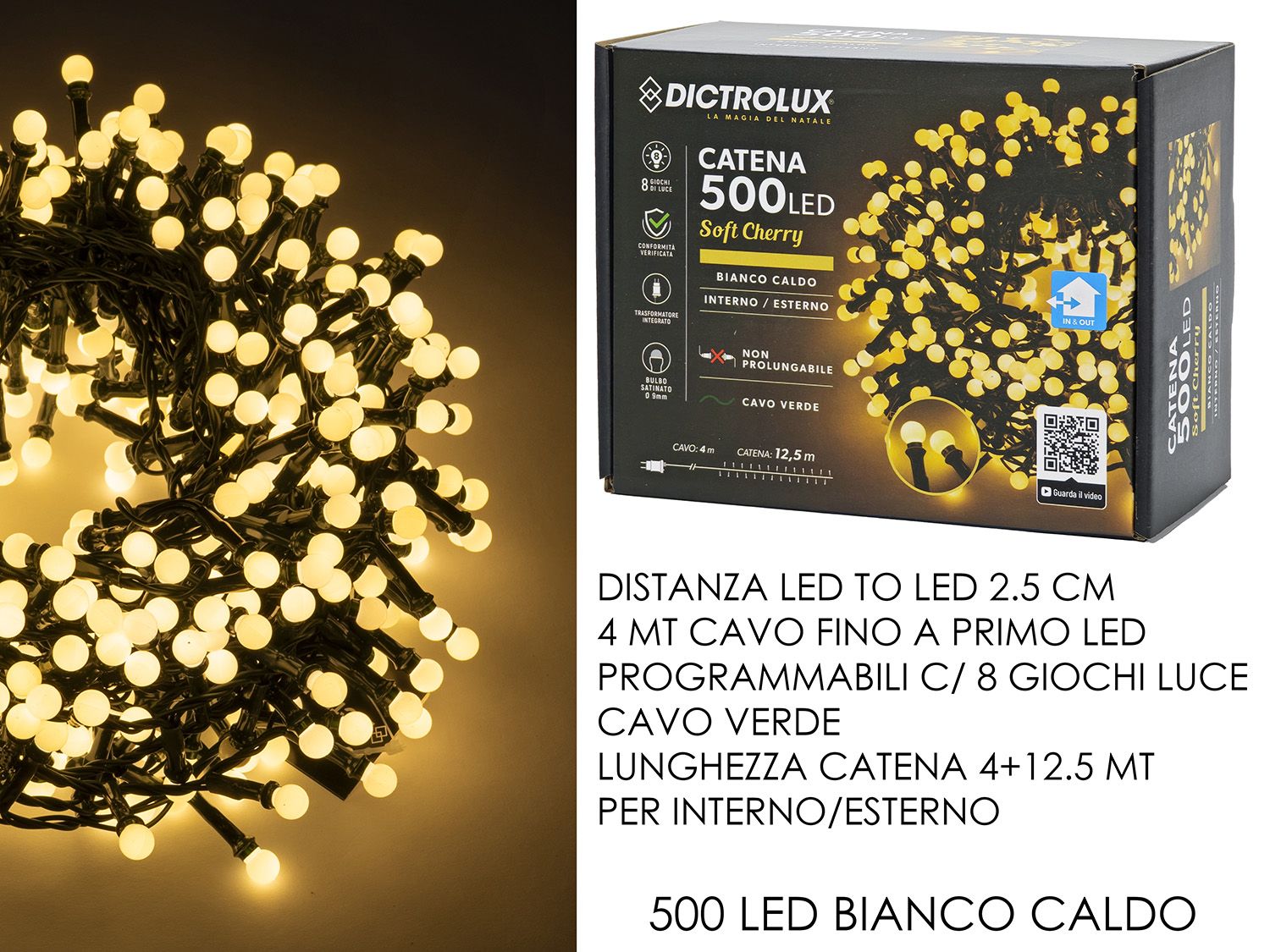 CATENA 500 LED CHERRY BIANCO CALDO CAVO TRASPARENTE