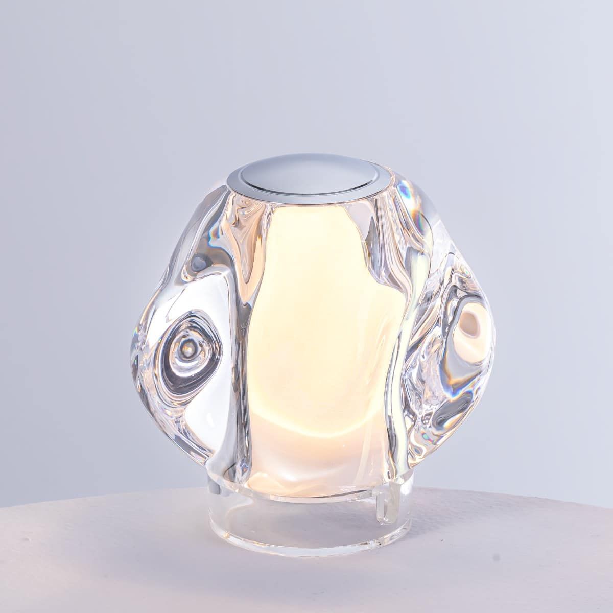 LAMPADA DA TAVOLO RICARICABILE LA CUI FORMA RICORDA UN CIOTTOLO LEVIGATO DAL TEMPO E MODELLATO DAGLI EFFETTI ATMOSFERICI, LA CUI FORMA CREA SFACCETTATURE DI LUCE.