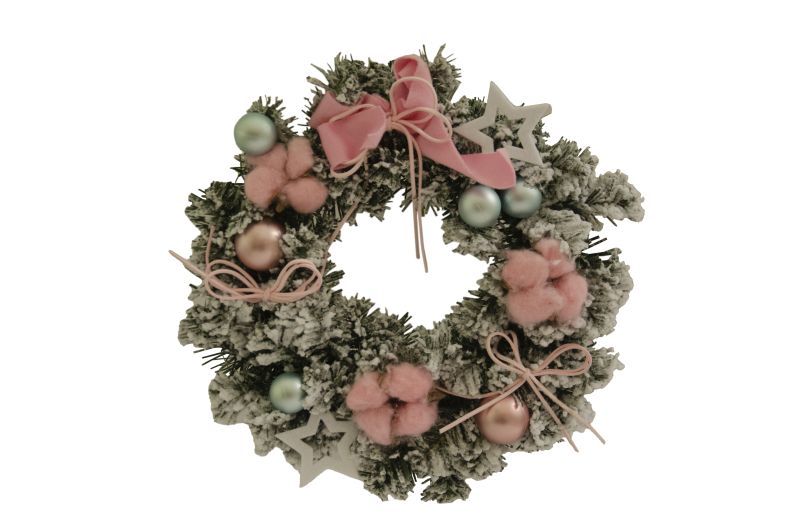 GHIRLANDA NATALIZIA INNEVATA CON DECORAZIONI ROSA E BIANCHE
