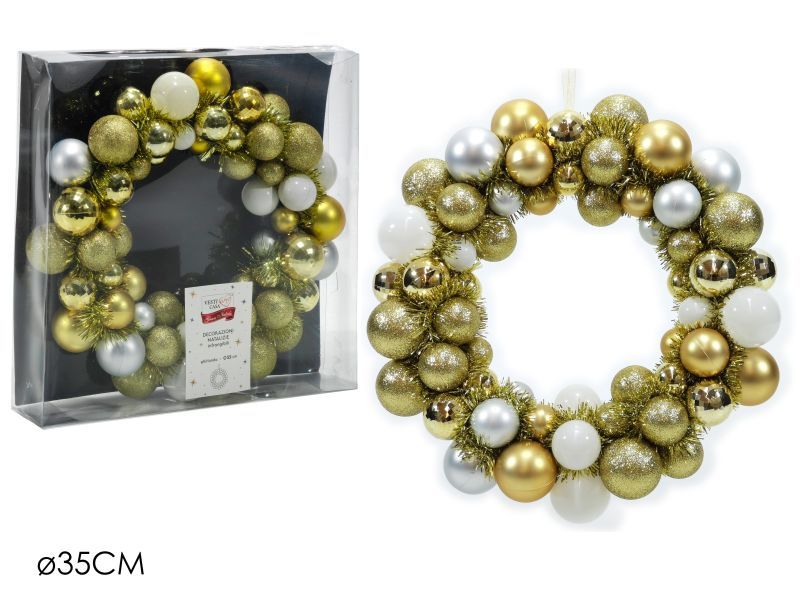GHIRLANDA DORATA COMPOSTA DA PALLE DORATE LUCIDE E OPACHE, PERLATE E BIANCHE
