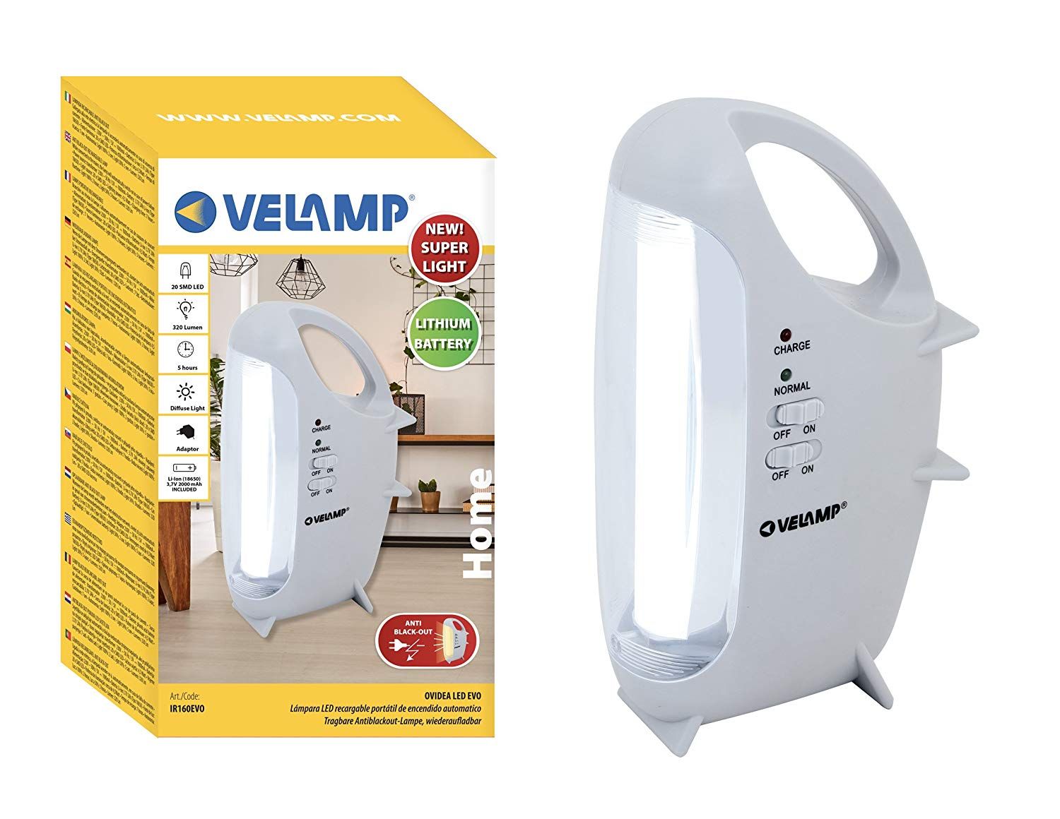 Anti black-out portable rechargeable lantern ovidea led evo. While connected to the mains, the lamp will automatically switch-on in case of power failure. Battery: 3.7V 2Ah Li-ion (type 18650). Light source: 20x SMD LED. Lighting power: 4,5 Watt. Runtime: light 100% => 2 hours, light 50% => 5 hours. Lumen 320. Material: ABS.
