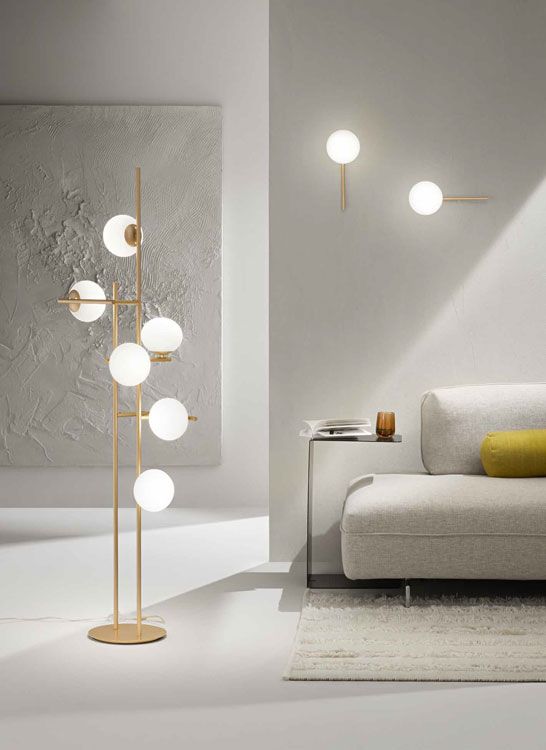 MODERNA ED ELEGANTE APPLIQUE COMPOSTA DA UNA SFERA IN VETRO SATINATO BIANCO ED UNA BASE IN METALLO DORATO DI FORMA ALLUNGATA