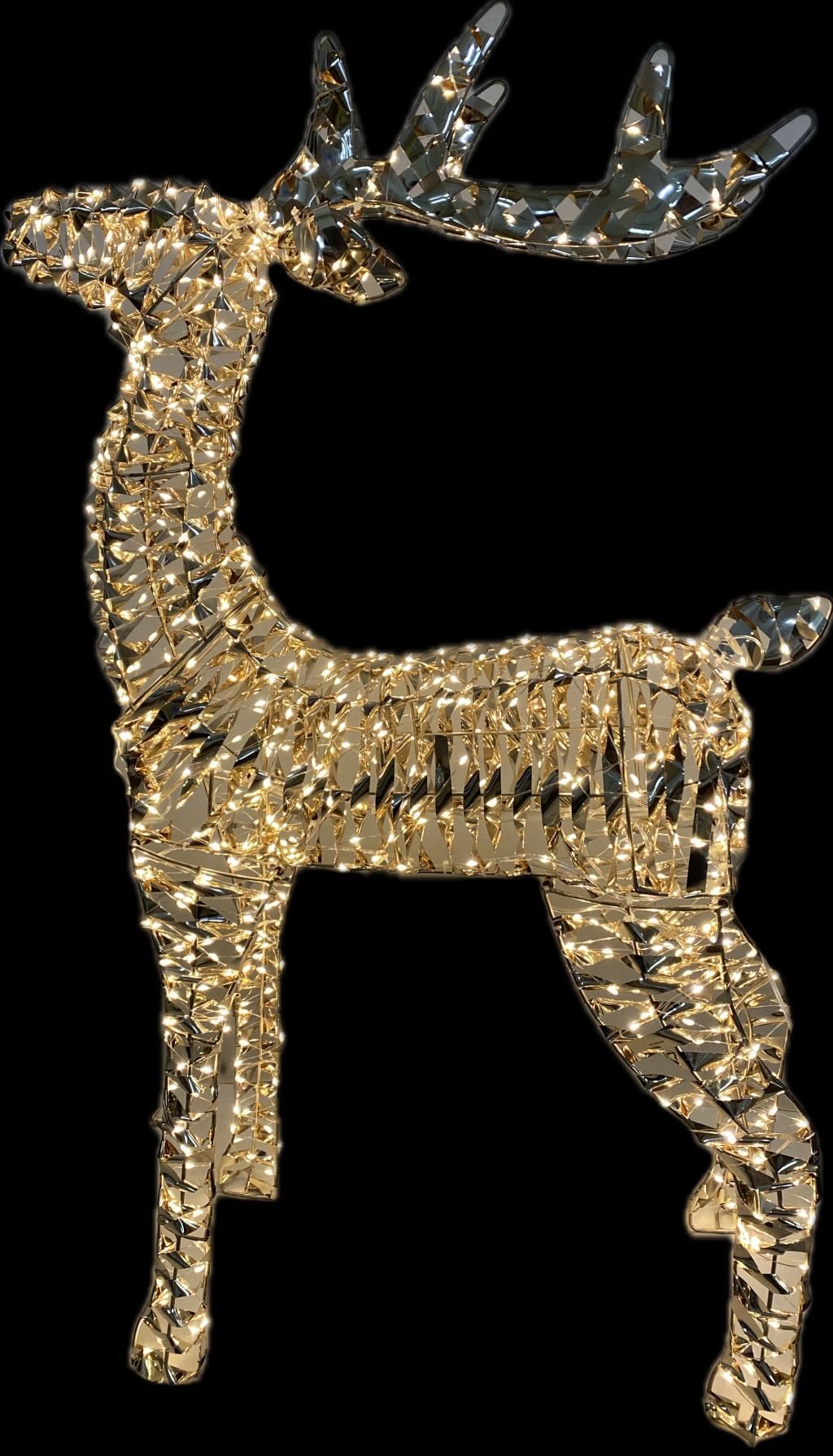 ELEGANTE RENNA CON STRUTTURA IN METALLO, NASTRO DORATO E 600 GOCCE LED BIANCO CALDO