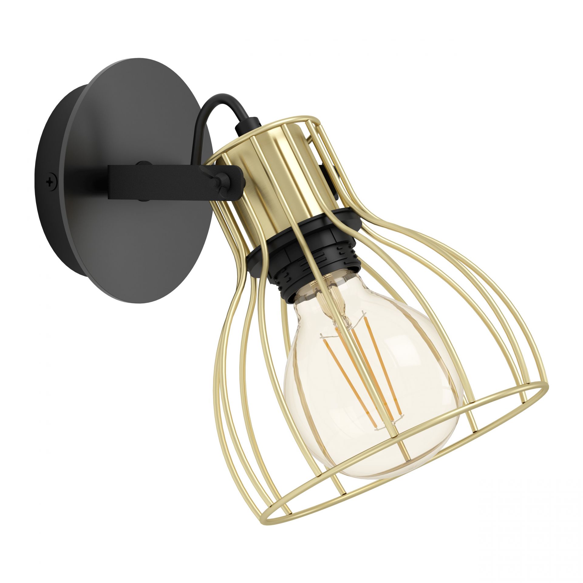 FARETTO DA PARETE ORIENTABILE, CON BASE TONDA IN LEGNO NERO E CORPO IN METALLO DORATO