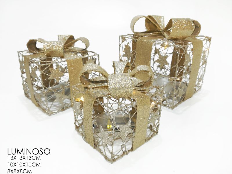 SET DI TRE PACCHI REGALO CON FIOCCO E STELLE GLITTER DORATI, CON MICROLED BIANCO CALDO, A BATTERIA