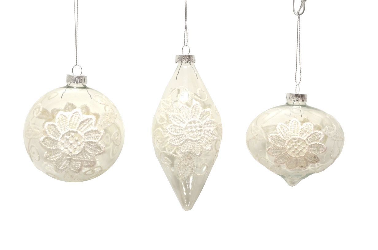 SFERA PER ALBERO DI NATALE IN VETRO BIANCO E DECORO IN PIZZO BIANCO IN RILIEVO, IN TRE FORME ASSORTITE