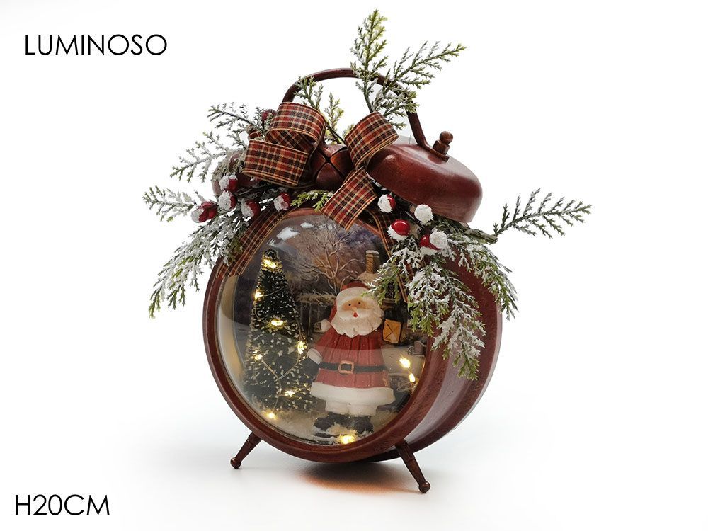 DECORO NATALIZIO A FORMA DI SVEGLIA CON FIOCCHI E RAMI DI ABETE ED ALL'INTERNO BABBO NATALE IN UN PAESAGGIO INVERNALE, ILLUMINATO DA MICROLED