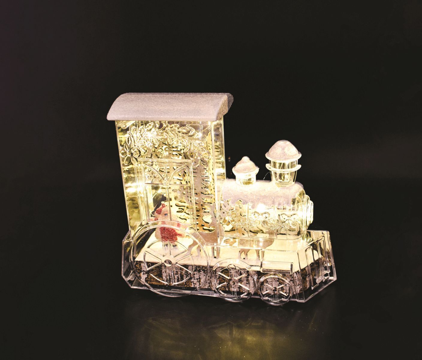 DECORO NATALIZIO A FORMA DI TRENINO CON ALL' INTERNO BABBO NATALE E RENNE IN UN PAESAGGIO INVERNALE